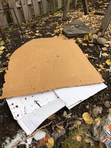 Cover the garden area with cardboard, or multiple layers of newspaper. If it’s windy, spray the newspaper with water to help keep it in place. Once down, wet the cardboard or newspaper so that it makes good contact with the soil. This paper layer forms a barrier that will help suppress weeds from growing up from underneath. - Mulch